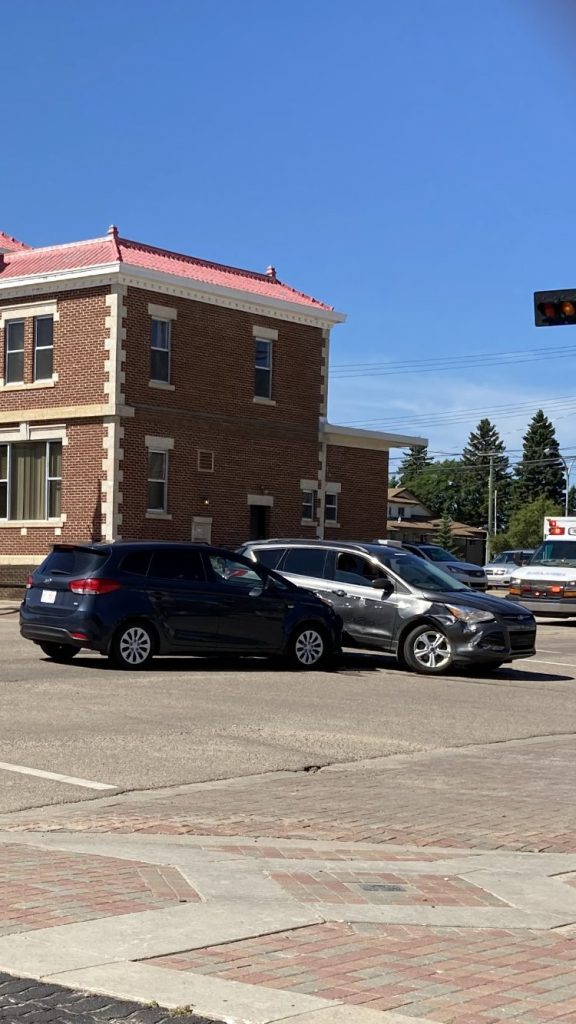 Emergency Crews were on scene at the intersection of 50 Avenue and 50 Street on Tuesday, August 4 after responding to a two vehicle collision. No injuries were reported. Resident Bryan Crossley captured this photo around 12:20 pm (Bryan Crossley/Photo)